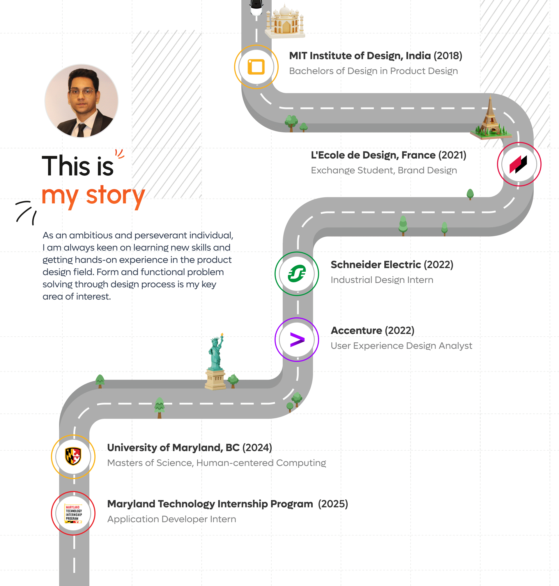 Multidisciplinary product designer with a strong foundation in both UX design and industrial design, bringing over 3 years of experience crafting human-centered digital systems, immersive 3D environments, and functional hardware prototypes. Currently pursuing an M.S. in Human-Centered Computing (HCI) at the University of Maryland, BC, serving as a Research Assistant and Student Association Senator.